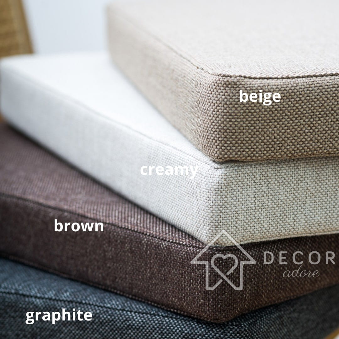 Wygodne poduszki do siedzenia, dostępne w różnych tkaninach. Wyprodukowane we Włoszech. Pokrowiec jest zdejmowany, zapinany na zamek błyskawiczny i można go prać w pralce (40 C). Zalecamy stosowanie poduszek na krzesła w celu ochrony naturalnej taśmy z trzciny.